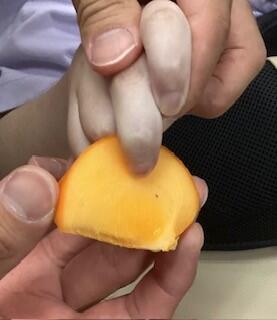 さて、高等部1コース(自立活動を主とする教育課程)の美術の授業では導入部で「今日を感じる」と題し「季節の物に触れて、感じたことを表出する」という学習に取り組んでいます。本校の生徒たちは日常的に車での移動が多いので、季節の変化に気づく機会が限られています。そこで、例えば夏はゴーヤ、秋は柿など、その季節特有の物にじっくりと触れたり匂ったりする活動をしています。生徒たちは目や口を動かしたり声を出したりして、それぞれが感じたことを豊かに表出しています。