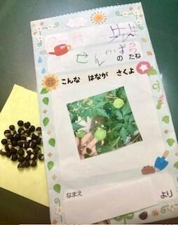プレゼントの際に児童から「フウセンカズラのタネにはハートの模様があります。タネをまいて育ててください。」とのメッセージをもらいました。小さい秋を受け取った気分になり、心がほっこり温まりました。