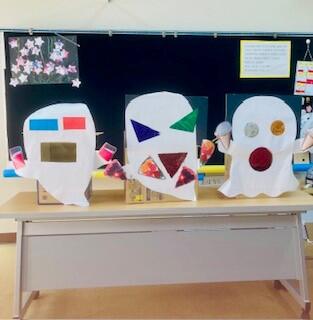 このとき、どのおばけの口に入れてもいいのではなく、チョコレートは四角い口のおばけに、ケーキは三角形の口のおばけに・・と形のマッチングをして食べさせるのです。