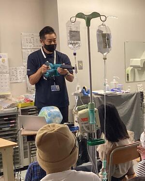 南極観測隊員が着用する越冬服やブリザード時の強風体験もしました。越冬服体験では、越冬服・手袋・長靴を、着たり手に持ったりして、暖かさや重みを実際に感じられました。強風体験では、初めは強風を怖がっていた児童生徒たちも、段々とやる気になり、最後は順番を待つ列ができるほどでした。