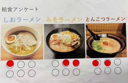 中学部給食委員会の取り組み「ラーメンの味」のアンケートを実施した結果、献立は『みそ豚骨ラーメン』に決まりました。