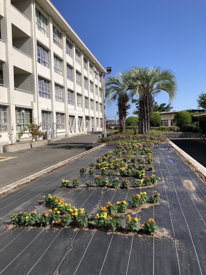 PTA実行委員会の後、PTA役員の保護者のみなさまを中心に、 本校の部活動部員や教職員も協力して環境整備活動をしました。 花壇の「KUMEDA」の花の植え替え、草抜き枯葉の掃除、芝生の防草シートも 設置していただきました。