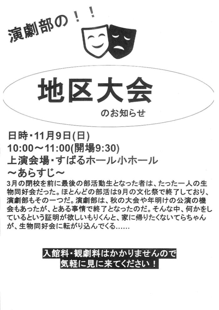 11/9(日)10時〜 すばるホール(富田林)で第75回大阪府高等学校演劇研究大会 H地区大会がありました。 美原高校演劇部は、顧問の先生と部員が協力して作り上げた「黄色い世界のその先に」を上演しました。 「笑いあり」「少しシリアス」な場面ありの作品で、あっという間の楽しい50分を過ごさせてもらいました。 演劇部は、この作品でみごと『府大会』に進むことになりました。 ぜひ次回も頑張ってほしいと思い...