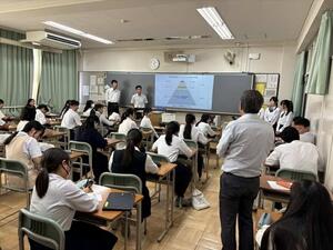 一人じゃなくてみんな(グループ)でいろんな資料を集めて、社会に貢献できるようなテーマを考えて、知恵を絞って研究をする...それがCSⅡの授業です。自主自立とか協働とか...まさに三国丘高校の風(校風)を感じられる取組と言えます。CSⅡのグループは各教科毎に分かれます。例えば、生物3班の研究テーマは「ドクターフィッシュの色彩と行動の相関」。この研究を突き詰めていく過程で、もしかしたら生物分野に深い関心を示す生徒が出てくるかもしれません。もっと先のことを考えれば、大学で生物学を研究し、何十年か先にはノーベル賞を受賞しているかもしれないと思うのです。荒唐無稽だと笑うかもしれませんが、夢とはそんなものです。だけど、夢があるから頑張れると思うのです。CSⅡは夢を感じることができる貴重な機会です。最後は、伝統です。CSⅡ中間発表の日は、毎年、たくさんの先輩たち(大学院生)が助言に来てくれます。後輩たちのために専門的な知見をもってアドバイスしてくれる姿は、伝統のなせる業です。時に厳しい意見や指導もありますが、それも伝統に裏打ちされた愛です。