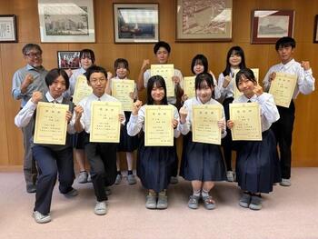 今日は、2学期中間考査の最終日。11時30分から、後期生徒会執行部役員の認証式がありました。校長から、生徒会長以下生徒会執行部役員に認証状が手交されました。まずは、みなさんのやる気を示すガッツポーズと、認証状を笑顔で受領する写真をご覧ください。