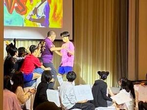2つめは、全体レクリエーションです。こちらは完全に生徒の企画です。長い時間かけて準備や練習をしてきました。前半はパフォーマンス、後半はクイズの構成です。クイズのための動画もたくさん撮りためていたらしく、校長室にも委員がきてくれて、インタビューを受けました。この日は10月30日でしたので、ちょうどハロウィーンです。生徒たちは思い思いの仮装をして会場に入ってきました。パフォーマンスは多岐にわたっていました。漫才にアカペラ、大画面を使った芸、マイケルジャクソンばりのカッコいいダンスもありました。運動部のマネージャーが踊るダンスはアイドルなみの人気でした。クイズは、野球部の監督とキャプテンで手押し相撲をやったらどっちが勝つかというガチの勝負や、先生方へのインタビューをもとにしたクイズなど盛り沢山で、終始笑いの渦に包まれていました。写真のほかに動画も撮ってきましたので、併せてご覧ください。
