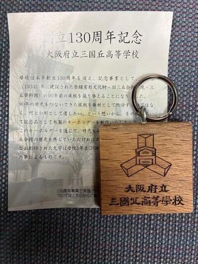 普通なら廃棄されるだけの床材をこんなふうに記念品にして、昔を懐かしむという発想が三国丘高校らしいと、私は思っています。母校を愛する気持ちというのはどの学校でも同じだと思いますが、130周年記念事業を通して感じたのは一体感です。どんなアイディアも否定せず、ひとり一人の思いを大切にする優しさが三国丘高校の良さだと思いました。このキーホルダーは三丘愛の詰まったお守りです。私がいただいたものは校長室に置いて、未来の三国丘高校を見守ってもらうことにします。