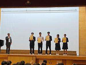 三国丘高校では、毎年この時期に三丘芸術祭を開催しています。三丘芸術祭は、一言で言えば芸術科目の成果発表の場です。芸術科目は、音楽・美術・書道の3科目で、1年時に選択履修します。美術又は書道を選択した生徒は作品の展示、音楽を選択した生徒は、クラス毎に課題曲と自由曲の合唱を披露します。自由曲は、クラス毎に自分たちで作詞作曲した曲を歌います。作詞作曲を生徒がするということ自体非常に珍しいことです。音楽祭が開催された11月7日までは、始業前も昼休みも校内に生徒の歌声が響いていました。クラス全員で歌うのは本番の日が最初で最後になるかもしれません。それだけに、緊張感に溢れたステージになりました。多目的ホールで合唱を聴いたあと、私を含む数人の審査員が別室で審査を行いました。今年は特に、音楽的なレベルが高かったようで、受賞クラスの決定は困難を極めました。今までにないコンセプトで挑んだクラスやオリジナリティの高い楽曲を完成させたクラスなど聴衆を大いに楽しませてくれました。卒業して長い年月がたった後でも、クラスのシンボル的な曲になってくれれば良いなぁと願っています。写真は授賞式の様子です。