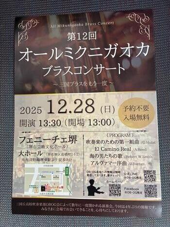 今年は、12月28日(日)、開演は13時30分。開場は13時です。場所はフェニーチェ堺大ホール。現役部員もOBOGも、みなさんに三国ブラスの魅力をお届けします。