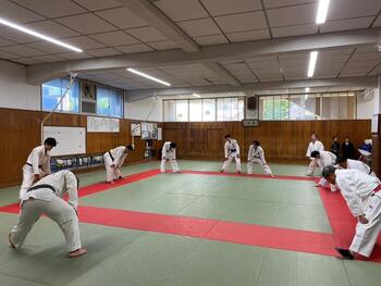 11月16日(日)には、このような窮地を何とかしようと、世代を超えたOBが集まり、練習会を開いてくれました。直近に卒業したOBは勿論、60歳台後半のOBまで、柔道を愛する方々が柔道場に集まり、柔道衣に着替えて乱取り稽古(試合と同様の形式の練習)をしてくれました。久しぶりに大勢のみなさんの元気な声が響く柔道場は、本来の機能を取り戻したようでした。唯一の現役部員にとっては、父親や祖父くらい年の離れた先輩方です。こんなにありがたいことはありません。身をもって先輩方の熱い思いを感じることができたのではないかと思います。写真をご覧ください。