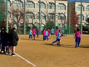 円陣を組み、クラスが一丸となって気合を入れてゲームが始まります。「勝つぞ!」と言いながら互いを尊重するのが三国丘流です。長身のバスケットボール部員のように活躍する選手がいる一方で、球技が苦手で、パスが上手く受け取れない選手もいます。それでもみんなが一生懸命頑張っているのを知っているから、ミスがあったときも「ドンマイ」「気にするな」という声が飛びます。応援も一喜一憂しながら、みんなで楽しんでいる様子でした。