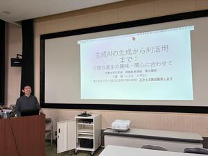 冬の三丘セミナー2日めのご紹介です。生成AIを含む先端技術開発の第一人者である、花園大学専任講師、久富 望 先生の講義に、115人の生徒と13人の保護者が詰めかけました。視聴覚教室は満員です。先生曰く、生成AIの利活用については、いろんなところで話題になるけれども、生成についてはほとんど取り上げられることがない...だけど、生成について理解できれば、利活用は自ずと答えが出る、とのことでした。