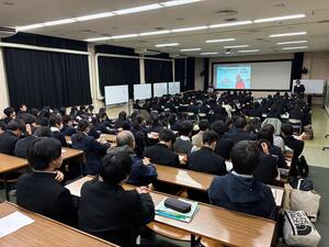 視聴覚教室は超満員です。佐伯先生が話しはじめると、三丘生たちの目が一斉に輝きだしました。「月探査が増えているのはなぜだと思う?」「月に水が存在したらどんなことに役立つと思う?」次々と投げかけられる質問に、ざわめきが止まりません。月の水の活用法...答えは燃料だそうです。ロケットの重量の8割は燃料らしく、月で燃料が補給できたら、火星が近くなるそうです。