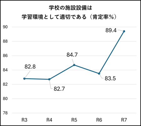 最初に取り上げるのは、学校施設設備に関する項目です。三国丘高校は府立ですので、一般的に考えれば、私立高校に比べて、施設設備の状況は劣っていることが想像できます。全館空調完備や人工芝のグラウンドなど、とても真似できないことはありますが、そんな中でも、施設設備に関する満足度は、89.4%と、非常に高い数値を示しています。しかも、昨年度に比べて5.9%も向上しています。その理由は何なのか...考えたとき、主に2つ思い浮かびます。1つめは、府教育庁がモデルケースとして実施した美装化です。教室棟2階の廊下や壁、すべての教室の黒板や床などを塗り替えるなどして、見違えるように美しくなりました。もう1つは、創立130周年記念事業です。本校卒業生や保護者のほか本校にゆかりのある方々から目標額の90%を超える多額のご寄附をいただき、体育館更衣室やトイレ、新三丘会館、旧三丘会館などの整備をしていただきました。こうした取組が、調査結果に影響しているのではないかと考えます。学校施設設備などの学習環境は、良いに越したことはありません。多額の資金をつぎ込んで、生徒が100%満足するような環境整備ができれば良いのですが、府立高校では難しいのが現状です。しかし、学校施設設備を使うのは生徒ですので、客観的に施設設備の状況を判断するのも大事ですが、その学校の生徒が現状をどの程度肯定しているかということも一つの指標になると考えます。