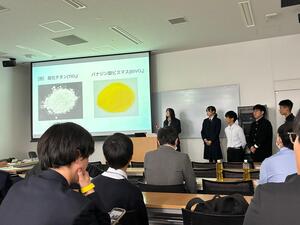 セレモニーの後はいよいよ発表です。三国丘高校からは理系3クラブ(理化部、生物部、天文部)が、日頃の研究の成果を発表しました。運動系クラブに例えていうならば、この日は公式戦。プレゼンテーションの後には、大学教授等の容赦ない質問が待っています。これに対して、冷静に、かつ論理的に答えることができるか...も、大きな評価材料になります。勝負の8分間が始まりました。順に紹介していきましょう。まずは、理化部です。