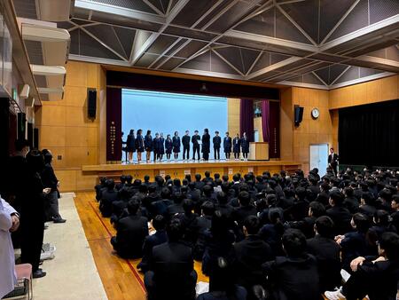 このブログは、三国丘高校の保護者、特に、78期生の保護者のみなさんに向けて書きます。写真は、昨日の終業式後の多目的ホールです。3年生(78期生)全員が集まり、舞台を見上げています。卒業式で自分たちが歌う曲の発表です。各クラスから選出された16名の卒業式委員が選んだ曲を、この場で合唱します。受験勉強の合間に、よくそんな時間があったなぁ...と感心するくらい、完成度の高いコーラスでした。曲を披露した後、卒業式委員の代表が、この曲に込める思いを述べました。