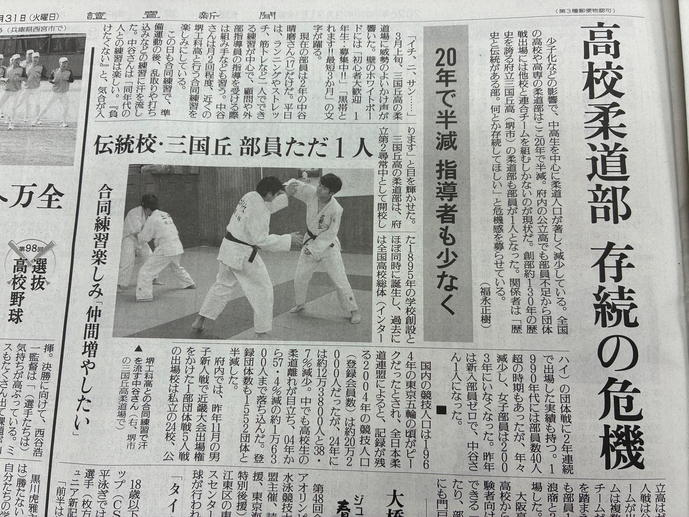 「伝統校・三国丘」をモデルケースとして、窮状を広く周知していただいているのが、この記事なのです。本校柔道部OBOG会からの働きかけをきっかけに、こんなに大きく取り上げていただきました。取材に応じていただいた、大阪高等学校体育連盟柔道専門部の先生方にも、心から感謝いたします。