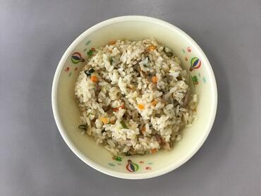 焼き飯は、細かくきざんだ肉や野菜をご飯と炒めて作る日本の料理です。日本のほかにも、同じような作り方をして食べる料理があります。例えば、中国ではチャーハン、インドネシアではナシゴレンなどがあります。米を主食にしている国では、家庭料理として親しまれています。 給食室では、炊けたご飯と具を大きな釜で混ぜ合わせて作ります。量が多いので、ちからいっぱい混ぜ合わせます。ぱらっとさせるために、ねばりけの少ない押麦を入れました。おいしく作れるように応援してもらえるとうれしいです!