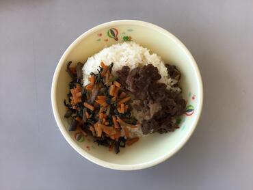 韓国では麦ご飯がよく食べられます。朝鮮戦争のあと、米が足りなくなり、麦を混ぜて食べていました。麦には、おなかの調子を整える食物繊維という栄養があるおかげで、今も健康的な食事として食べられています。給食のビビンバも麦ご飯にしています。麦ご飯のうえに盛りつけたおかずを、ご飯によく混ぜて食べましょう。