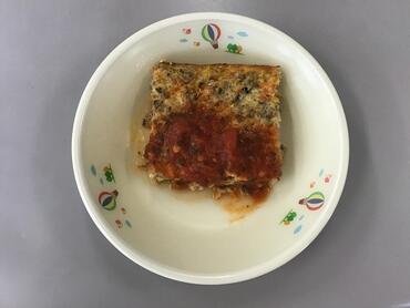 給食のオムレツには、にんじん、たまねぎ、ひき肉などを入れて、たんぱく質やビタミンなどの栄養をプラスし、食べごたえがあるようにしています。また、手作りのトマトソースを別の食缶に入れています。トマトのあまみとすっぱさが、オムレツによく合うので、オムレツにかけて食べてみましょう。