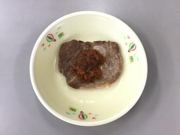 給食のソースは、ケチャップのほかに、赤ワインやウスターソースで玉ねぎを煮込んで作る手作りソースです。パセリも入れて香りよくしあげています。