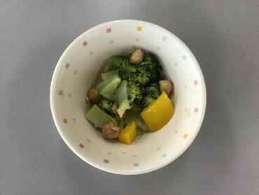 手作りの玉ねぎドレッシングでブロッコリーと豆を合わせたサラダです。豆には、体をつくるもとになるたんぱく質やおなかの調子をととのえる食物繊維などの栄養がたくさんあります。