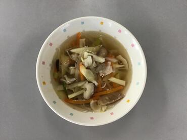 沢煮椀(さわにわん)は、豚肉や千切りにした野菜がたくさん入った汁ものです。昔、イノシシなどを捕まえる人が山に行くとき、日持ちする塩漬けの肉を持って行ったそうです。そして、持って来た肉と山菜を一緒に汁ものにして食べたのが始まりといわれています。給食には、たくさんの野菜を入れています。何が入っているかわかるかな?