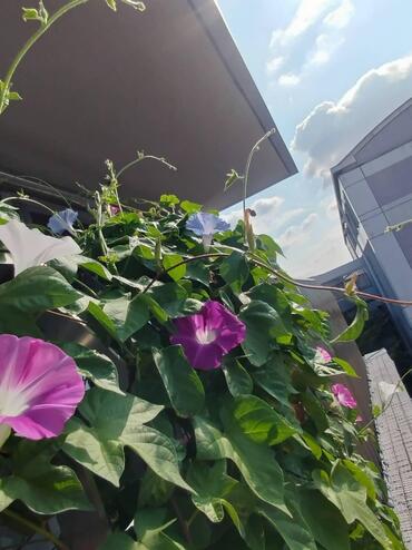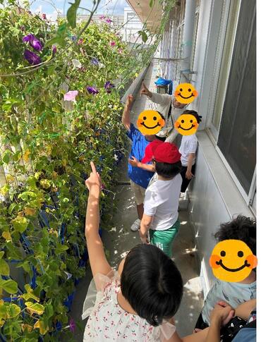 5月に種まきしたアサガオが、見上げるほど伸びてたくさん花が咲きました♪みんなで毎日水やりしたり観察したり、大事に育てています。まだまだ暑い日が続きそうなので、頑張って咲いてくれますように***