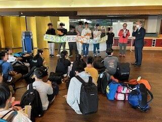 宿泊するホテルに着いて、ホテルの人たちにあいさつをして入所式をしました。その後は、入浴タイム。大きなお風呂は貸切状態、また、豪華な夕食もいただきました。夜の集いでは、何が落ちたゲームとジェスチャーゲームで盛り上がりました。翌朝、朝の集いでダンスをして体を動かし、そのあと朝食をいただきました。その後、退所式をし、志摩スペイン村に向かいました。