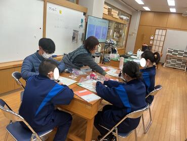 3学期の授業が始まりました!1月9日(金)授業初日の様子を紹介します。音楽Bグループでは日本の民謡について学びました。北海道・青森県・山形県・大阪府の民謡を聴きました。どんな風に聴こえたかを生徒たちそれぞれの言葉で表現していました。Aコースの家庭科ではリース作りをしています。頑張って布を裂きました。もう少しで完成します!