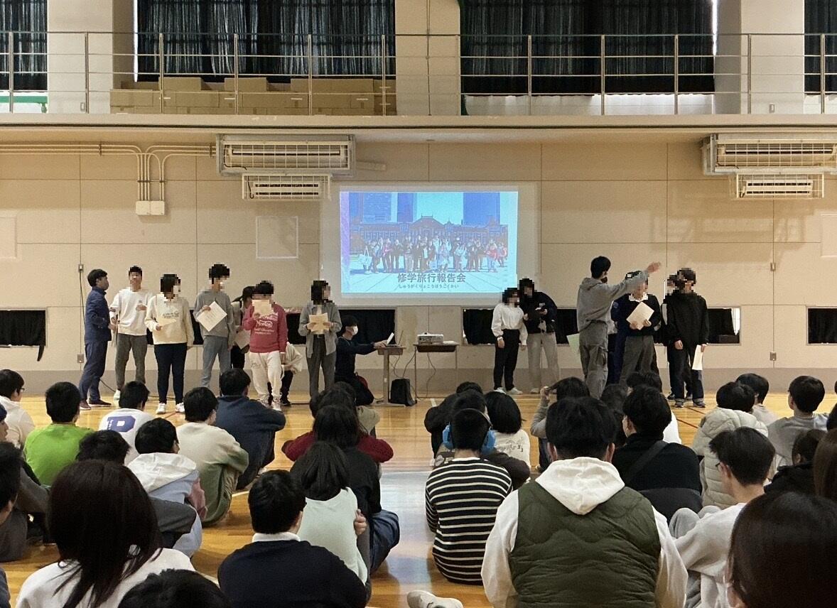 1月8日(木)に始業式と全校集会を行いました。始業式では全校児童生徒が大きな声で元気よく校歌を歌いました。校長先生からの話も集中して聞いていました。そして後期児童生徒会役員が司会をして全校集会も行いました。今回は高等部3年生が、修学旅行の報告をしました。2泊3日の楽しい思い出を発表していました。