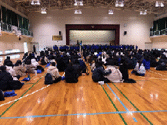 耐寒行事として予定していた岩湧山登山の代替として、バレーボール大会と百人一首大会を実施しました。準備期間があまりなかったにも関わらず、実行委員の生徒たちを中心にさまざまな工夫をしながら、当日は大いに盛り上がりました。バレーボールと百人一首それぞれの優勝クラスとともに、両部門の戦績による総合優勝クラスを表彰しました。閉会式では、音楽選択者による合唱も披露され、最後にはPTAで用意していただいた景品を戦績順に選び、どのクラスもみんなで仲良く分け合いました。
