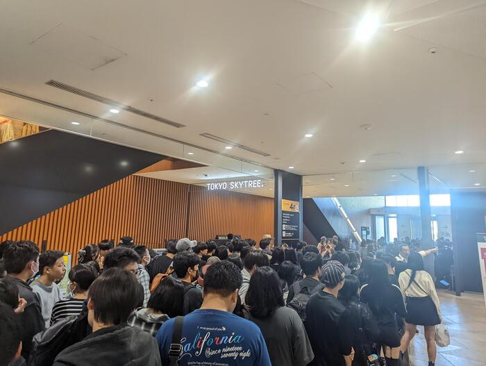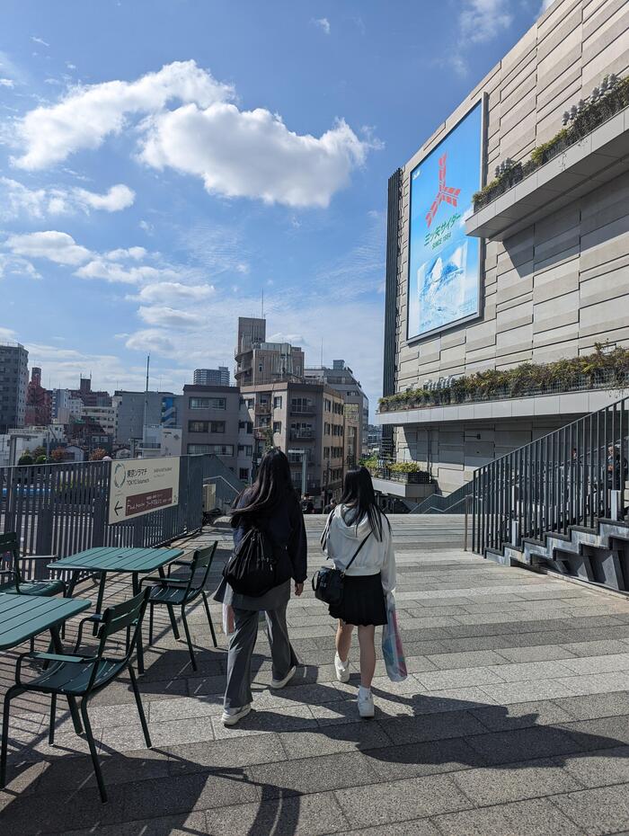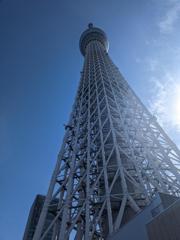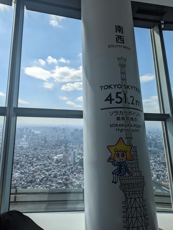 天望デッキからさらに100mエレベーターで昇り、「天望回廊」に到達しました!地上約450メートルの場所にある、ガラス張りのスロープ状の回廊で、まるで空中を散歩しているような特別な体験です。