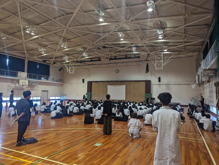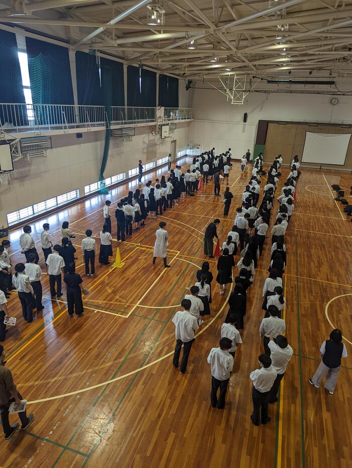 体育館で結団式が始まりました。私から挨拶(3日間でやって欲しいこと)を伝えました。①時を守り、② 場を清め、③礼を尽くす、です。集合時間の厳守を心掛け、民泊先やホテルで整理整頓し、お世話になる方々や保護者へ挨拶や感謝の気持ちを伝えることを心掛け実行して欲しい。それが出来た!と振り返ることができれば、生涯忘れることができない、いい修学旅行になること間違いなし!ともに楽しみましょう。