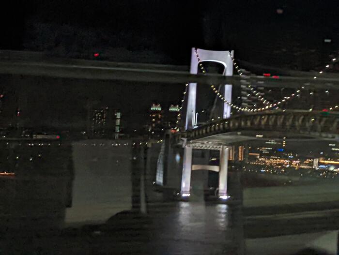 21:20が近づいてきましたが、地上150mの透明の道は避けて通りました。この後、レインボーブリッジを通って舞浜ユーラシアホテルへ向います。橋が封鎖されていませんように。(古い映画ネタで「踊る大〇〇〇」)