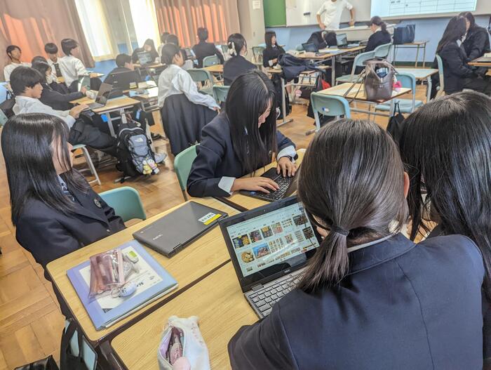 木曜日の6時間目はロングホームルーム(LHR)の時間です。総合学科である本校は、クラスみんなで授業を受ける時間も普通科高校より少なく、クラスメイトと交流する貴重な時間です。このクラスは文化祭にむけて、グループでの情報収集に、一人一台端末(Chromebook)を活用していました。あと2週間、どんなクラス企画が形になるでしょうか!こうご期待を。