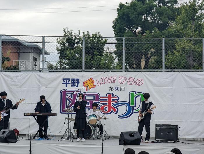 本日、平野区民まつりのステージで、軽音楽部が演奏の機会をいただき、2曲を披露しました。楽器のトラブルもありましたが、日頃の練習の成果を発揮できたのではないでしょうか。地元市民のみなさまへ、長吉高校で部活動に打ち込み、頑張っている姿を示せました。開催に関わられた関係者のみなさまへ感謝です。
