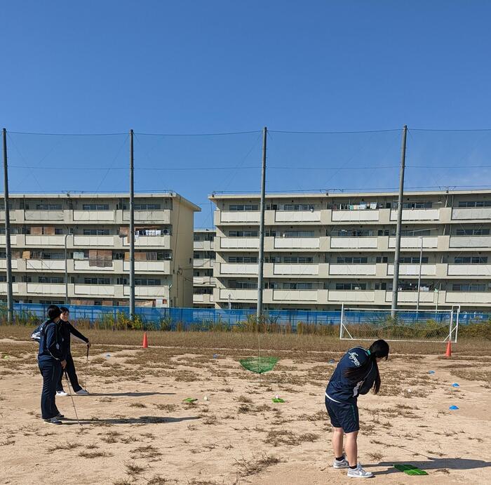 晴天のグランドに授業見学に行くと、ゴルフクラブを持つ面々が。選択授業のスポーツCでは、ターゲットバードゴルフを楽しんでいました。「これを決めたらバーディーや!」、「うわOBや〜」、歓喜と悲鳴の声が飛び交う楽しい1時間の見学でした。総合学科では、様々な授業を選択できます。生涯スポーツとして、いつの日かゴルフコースを経験する人がいるかもしれませんね。本日は練習ラウンドということでしたが、今後は生徒たち...