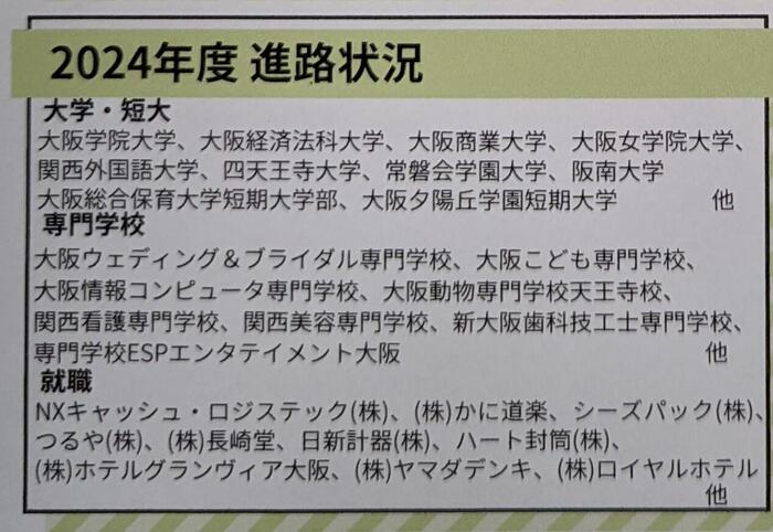 写真は、2024(令和6)年度の卒業後の進路先の一部を紹介しています。半数近くは企業への就職、40%近くが大学・短大・専門学校への進学でした。例年、この比率が続いています。 就職希望者は、今年も「内定率100%」を達成しました! ●地元就職をめざしやすい(求人件数) ●高卒就職という選択肢も尊重される(先輩の声) ●進路について早くから考えられる ●将来を一緒に考えてもらえる