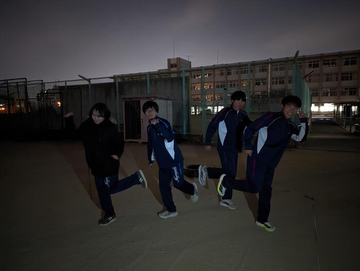 日が落ちて真っ暗なグラウンドから元気な声が聞こえるので足を運んでみると、陸上部員がトレーニングに励んでいました。運動部指導員(本校の非常勤講師を勤めてくださる好青年)の指導で、やらされる練習でなく、生徒たちは生き生きとしていました。現在、部員5名とMG2名です。四月から新入生も加えて記録会や大会に参加したい!そんな目標を語ってくれました。