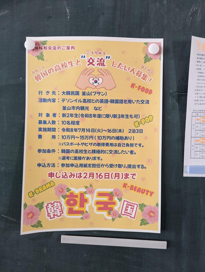 大阪府は、府立高校の英語力向上と国際交流を目的に、全ての府立高校に海外の姉妹校を設ける取組みを行っています。本校は昨年10月に韓国・デソンイル高校と姉妹校提携を結びました。写真は7月に初めての交流に向けての案内です。中学生も、高校2年次に参加の機会を紹介する予定です!