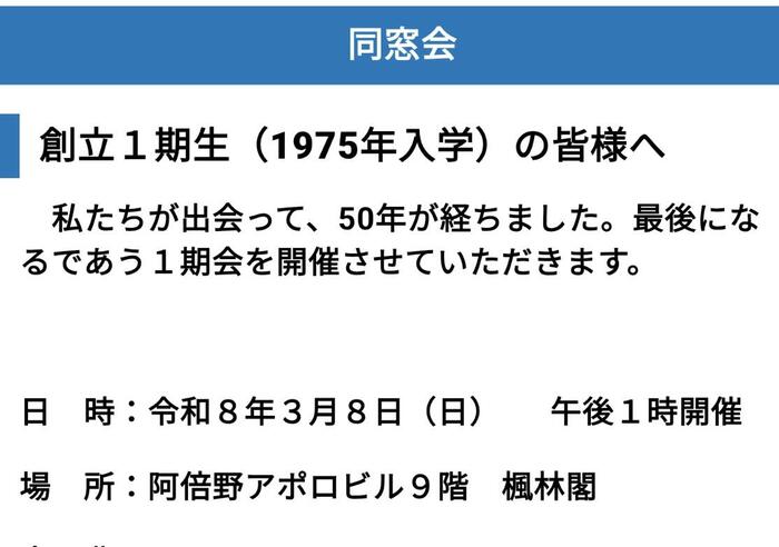 本校の同窓会は毎年定例の活動を続けています。私も就任当初に、本校中庭で集う「桜を見る会」に参加させていただきました。長吉高校を母校とし、母校を愛する卒業生のみなさんとご一緒できた日が校長としてのスタートとなり、忘れられない記憶です。令和8年の3月に、長吉高校1期生の同窓会が開催予定です。詳しくは、学校HPからも紹介します。是非ご参加ください!