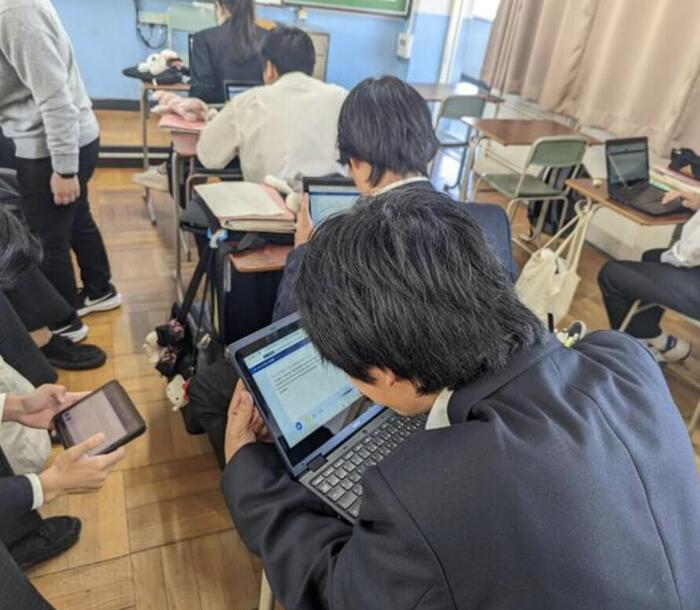 写真は一人一台端末を無償で貸与する大阪府の取組みで、生徒が日々使用している端末です。デジタル社会に対応する府立高校です。因みに教職員のアンケート結果、「電子黒板等I CT機器を活用し、授業を行った」 (教職員)の肯定的回答 95.2%です。時代の流れを感じます。