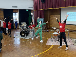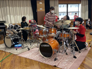 3月24日(金)午後、「ドラムフェスタ中津支援Ver.」を行いました。大阪音楽大学の園田教授とD.D.Dクラブ(ドラム、大好き、大集合!)のみなさんが来校され、、中学部・高等部の音楽で取り組んできたドラム演奏の他、小学部から高等部の児童生徒が楽しめる音楽を準備してきてくれました。