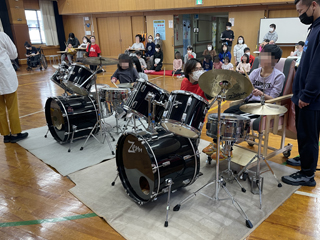 プログラム3番はドラム体験パート2です。少し大人な曲『Butttre』を演奏しました。学生さんの素晴らしい見本を見せてもらってからの体験でした。プログラム1番のドラム体験の時と同様、児童生徒が積極的にドラムセットに向かっていました。
