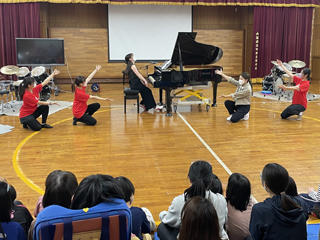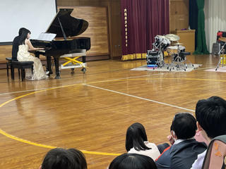 プログラム5番はスペシャルステージ! 音大生による本気のピアノ演奏でした。迫力のある連弾とソロを聴きました。聴き馴染みのある曲が流れると、児童生徒たちは穏やかな表情で、時に優しく時に力強いピアノの響きに聴き入っていました。