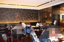 空港を出発して、宿舎のビッグ・アイ(国際障害者交流センター)に到着すると、お世話になる職員の方に入館の挨拶をして、各居室に向かいました。お部屋のお風呂に入った後は、施設内の夕食会場に行き、ハンバーグ定食の夕食を食べました。お昼ご飯にビュッフェでたくさん食べたからか、食の進み具合は全体的にゆっくりでした。楽しく1日の出来事を伝えながらワイワイと食事を行ないました。