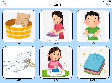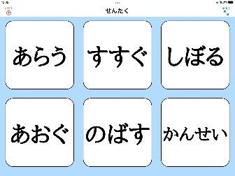 【方法等】 ① 洗濯に関する動詞を確認しながら導入の絵本を読む。 ② 動詞が書かれたひらがなの札とイラストをマッチングしながら順に並べる。 ③ 実際にその動作を体験する。その際、タブレット端末を押すと音の出るアプリ(drop tap)を使用し、正しい動詞を押してから活動する。「あらう」を押すとジャブジャブと洗う音が流れる。児童の実態に合わせてイラスト入りか文字のみかを使い分ける。 |