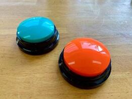 【ねらい】 意思表示やコミュニケーションをより豊かにしていけるように、2台のVOCAを左右の手で入力し分けて「はい」「いいえ」を表出することができる。 【方法等】 ①市販の録音ボタン(1台1,000円程度)を2台用意してVOCA(音声コミュニケーション支援機器)として使う。 ②それぞれの録音ボタンに「はい」「いいえ」の音声を録音する。