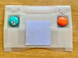 ③ プラスチックダンボールとPPシート(いずれも100円ショップで購入)で専用の台を自作し、右側に「はい」、左側に「いいえ」のスイッチを設置する。 台を自作することで、 ・スイッチ面の段差を解消し、手指の引っ掛かりによるミスタッチを防ぐ ・常に同じ位置にスイッチがある環境をつくることで、対象児童が手探りで操作できるようにし、操作と音声再生に一貫性を持たせて因果関係の理解を促す の2点をねらいとした。